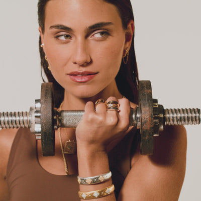 Their composition? The jewelry ismade of brass, because, for a designer, brass is a material of choice: it offers infinite freedom in terms of shapes, textures, and finishes, allowing her to bring every imaginable fantasy to life.